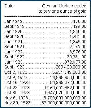 There have been many times in history when hyper-inflation has destroyed the value of currency. France alone has had run-away inflation on at least a dozen occasions. One of the most famous examples of hyper-inflation occurred in post-World War I Germany. Here is a chart that shows the number of marks needed to buy one ounce of gold: