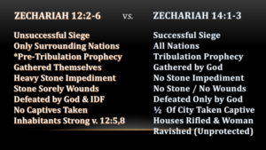 Subsequent to this successful conquest of Jerusalem in Zech 14:2, Jesus Christ single-handedly defeats the Antichrist and his armies in fulfillment of Rev 19:11-21. The differences between the Zech. 12:2-6 siege against Jerusalem is starkly different than the one in Zech. 14:2-3. The comparisons are below.