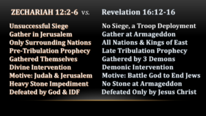 The differences between Zech. 12:2-6 and Rev. 16:12-16 are identified below. These comparisons strongly suggest that these are two distinctly different wars.