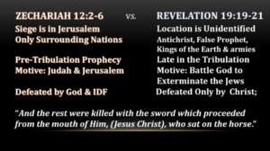 Thus far, I have demonstrated the stark contrasts between Zech. 12 and Zech. 14 and also between Zech. 12 and Rev. 16. Now I’ll attempt to disconnect Zech. 12 from Rev. 19.