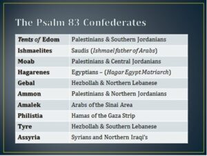 These surrounding peoples are identified in the prophecy of Psalm 83 and many other scriptures. The central theme within the Psalm is the intent by these Arabs to destroy Israel so thoroughly that even the name of Israel would be forgotten forever.