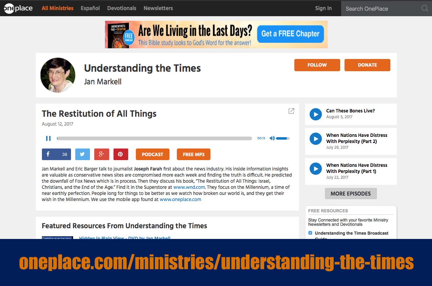 A compelling look at current events, Bible Prophecy and apologetics with interviews of well-known authors and prominent leaders from around the world. Host, Jan Markell founded Olive Tree Ministries in the 80s to teach believers how to be watchmen on the wall and understand the times from a biblical perspective. She is the author of 8 books and has produced a dozen DVDs. Her popular radio program is hearing on over 800 radio stations across North America. She hosts the largest Bible prophecy conference in America.